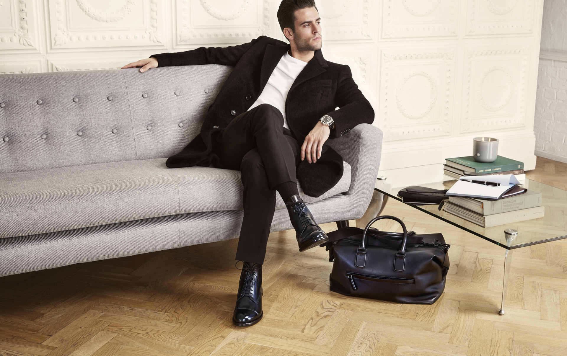 Male model in stylish formal wear sitting on grey sofa with legs crossed